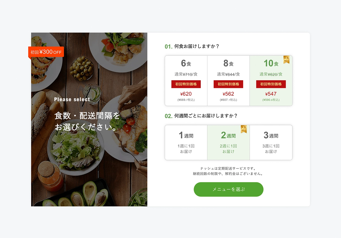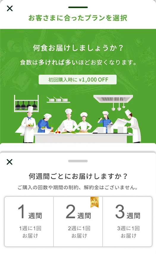 定期配送の間隔を「1週間に1回」「2週間に1回」「3週間に1回」の3種類から、一度の配送でお届けする食数を「6食」「8食」「10食」「20食」の中からお選びください。